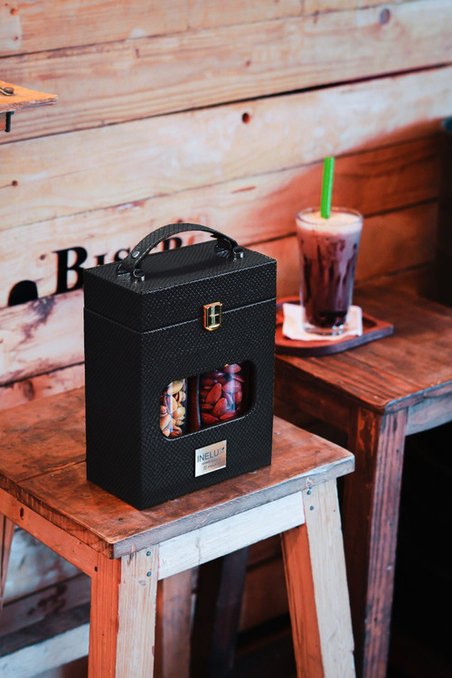 باکس 2 شیشه چرمی زرنگار با محتویات پسته اکبری دستچین و بادام هندی اعلا
