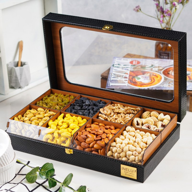 باکس هدیه آجیل لوکس وارتان با محتویات پسته اکبری ، بادام هندی ، بادام درختی ، فندق ، مویز ، کشمش عسگری ، انجیر و گردو در جعبه 8 خانه نفیس چرمی