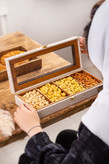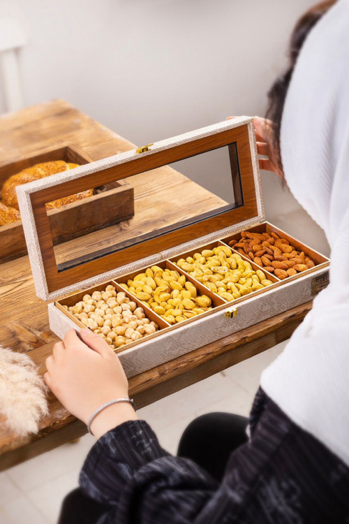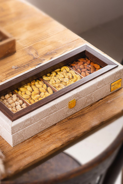 باکس هدیه آجیل لوکس گیلدا با محتویات پسته اکبری ، بادام هندی ، بادام درختی ، در جعبه 4 خانه نفیس چرمی